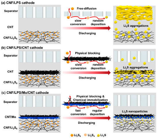 Schematic showing electrochemical behavior or electrodes comprising carbon nanofiber/lithium polysulfide (CNF/LPS) (a), CNF/LPS/carbon nanotube (CNT) (b) and CNF/LPS/Mo/CNT (c), the latter of which prevents free diffusion of LPS and catalyzes their conversion to lithium sulfide. Reprinted with permission from reference [46]. Copyright 2020 American Chemical Society.