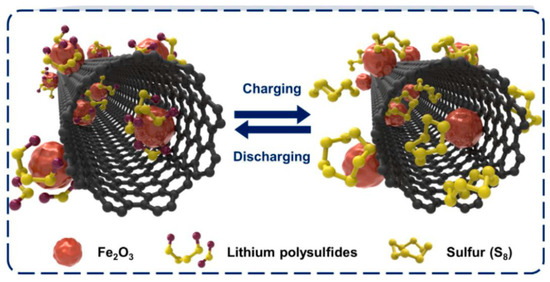 Schematic Demonstrating the interaction of iron oxide particles with sulfur and polysulfides during charging and discharging processes. Reprinted with permission from reference [49]. Copyright 2020 Elsevier.