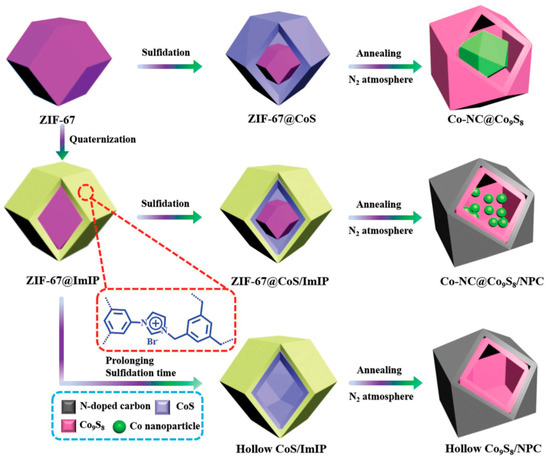 Another example of carefully-designed nanoarchitecture is illustrated by the use of hollow nanostructures, wherein pores/transport channels and strategically-positioned catalytic sites within the structure can endow enhanced transport and activity [54]. A double-shelled hollow polyhedron comprising nitrogen-doped carbon nanodots, for example, can contain cobalt nanoparticles to give such an assembly (abbreviated as Co-NC@Co9S8/NPC) built within the framework provided by ZIM-67 (Figure 11). The purpose of the cobalt is again to facilitate redox reaction while adsorbing polysulfides. The double-shell configuration holds materials in a confined space as a nanoreactor which cleverly suppresses the shuttle effect while enhancing ion/electron transport. Over an impressive 2000 cycles, the capacity decays only 0.011% per cycle (2 C). After 500 with a high sulfur loading (4.5 mg cm−2) the cell still operated very efficiently, validating the benefit of the nanoconfinement approach. Several other studies on hollow structures to serve as nanoreactors and to control volume changes have also been noted recently, as discussed below.