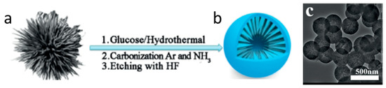 Use of silica particles (a) as a scaffold for assembly of hallow carbon nanospheres (b) having silica rib-like fine structure on the interior, as demonstrated in an SEM image (c). Reprinted with permission from reference [55]. Copyright 2020 John Wiley and Sons.