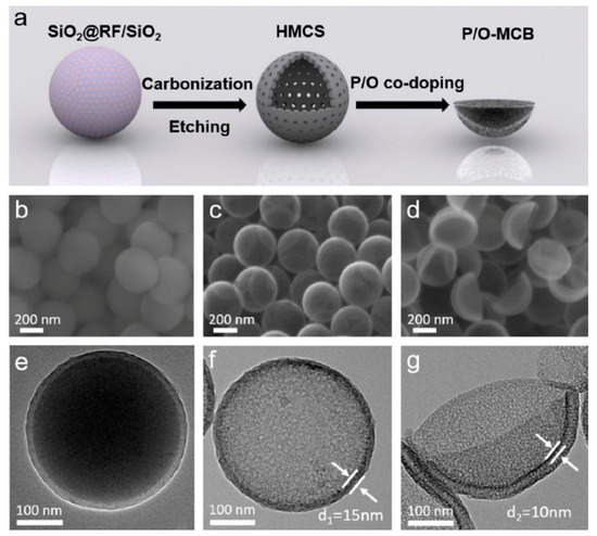 Process (a–c) for preparing phosphorous/oxygen co-doped into mesoporous carbon bowls (d,g) from initially-formed spheres (b,c,e,f). Reprinted from reference [58], © 2020 used with permission from Elsevier.