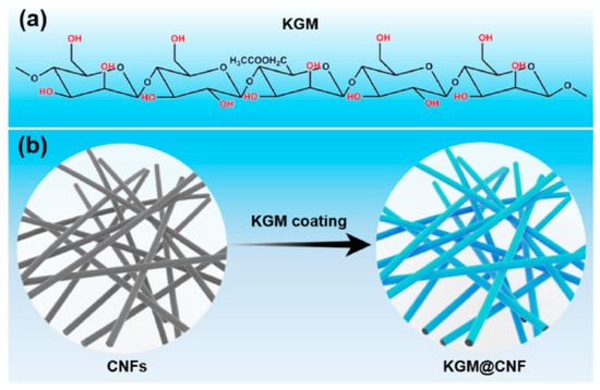 Structure of konjac glucomannan (KGM, (a)) and schematic for how it is made into a mat of KGM-coated fibers to be used in a Li-S battery (b). Reprinted from reference [101], © 2020 used with permission from Elsevier.
