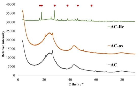 The simple impregnation method followed by hydrazine hydrate reduction allowed to incorporate rhenium species within the oxidized active carbon matrix. The XRD method was used to analyze the possible phase changes during active carbon processing. Both active carbon and its oxidized form revealed two characteristic carbon signals around 26° and 42° (Figure 1). High intensity indicated its relatively good ordering; however, the increased width may be affected by the complexity of the amorphous and ordered domains. AC-ox showed signals slightly shifted towards lower angles mainly because of expanding the voids and pores by the oxygen-containing groups. Addition of ammonium perrhenate with subsequent reduction strongly ruined the ordered carbon domains but rhenium species were trapped within the carbon matrix. The obtained signals were attributed to ammonium tetraoxorhenate (VII) (DB card numer: 01–085-0346 based on PDF-2 Release 2020 RDB).