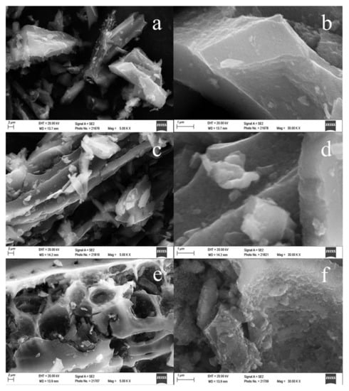SEM images showed the change in morphology of the parent active carbon and materials obtained after its oxidation and metal doping. Images were registered at magnification 5000× and 30,000×. It can be noticed that the starting active carbon was composed of various size particles with compact bigger blocks (Figure 2a,b). Oxidation of the carbon precursor broke and crushed bigger blocks, producing smaller particles debris (Figure 2c,d). Impregnation with ammonium perrhenate and hydrazine hydrate reduction induced partial corrugation of the smaller particles caused by desorption of the oxygen-containing groups. This process exerted a big pressure on the carbon structure, resulting in pore opening/damaging the walls of the ordered pores structure (Figure 2e). The resulting rhenium-modified active carbon was very serrated (Figure 2f) or exfoliated (term used more appropriately for graphene-like materials).