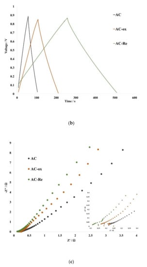 The imaginary vs. real impedance relations, which can be seen in the Nyquist plots, were significantly steeper for AC-Re with a lower solution resistance value (zoomed high-frequency region). Consequently, penetration of the carbon pores was enhanced by rhenium species doping. The calculated charge transfer resistance was 0.07, ~0.10, and 0.06 Ω for AC, AC-ox, and AC-Re, respectively. It should be emphasized that the low-frequency region was significantly scattered for AC-ox. The semi-circle, which can be observed typically for pseudocapacitive materials, was very small in AC-Re. This is a consequence of the reduction of most oxygen species by hydrazine, therefore the redox reactions are combined only with rhenium species rather than residual oxygen groups.