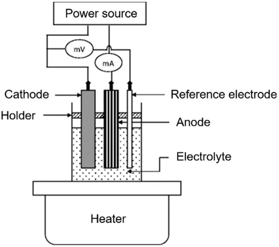 Electrodeposition, also known as electroplating, is an electrochemical process that produces thin films while cations in the electrolyte are driven by the force of an electric field and accordingly move to the cathode, which is usually an “inert” material (e.g., gold or platinum) and where the cations are reduced to metals, an alloy, or react each other to form a compound. Shown in Figure 1 is a typical electrodeposition setup including an anode, a cathode, a reference electrode, the electrolyte and a power source that generates a constant DC voltage (potentiostatic) or a constant DC current (galvanostatic) [27]. A heater can be adopted to adjust the temperature of the electrolyte. The mechanism of electrodeposition can be generally expressed by the formula