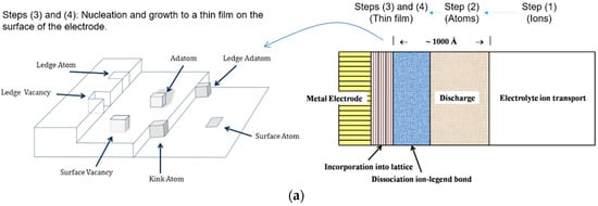 Electrodeposition typically involves four steps as schematically represented in Figure 2a: (1) Cations in the electrolyte are driven by the electric field and transport toward the cathode; (2) the cations enter the discharge region, which is within about 1–1000 Å from the cathode surface and where the cations receive electrons and turn to atoms; (3) the atoms diffuse to the cathode and then attach onto the cathode surface at energetically favorable sites and (4) the atoms aggregate and/or react to each other to form nuclei of an element, an alloy or a compound; the nuclei grow to grains and eventually result in the formation of a film on the surface of the cathode [27,28,29,30]. As a consequence of such a transport–adsorption–nucleation growth process, the grain size, morphology (i.e., microstructure), crystal structure and quality (e.g., the density and homogeneity) of films produced with an electrodeposition method are related to multiple factors, which primarily include: