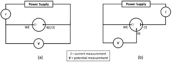 Two-electrode configuration (a) and three-electrode configuration (b) in the electrochemical system [33].