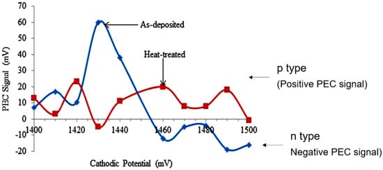 Matsuda et al. studied the electrodeposition of ZnS [85]. They found that a combined use of boric acid to control the pH of the electrolyte and a mixture of citrate acid and malonic acid as the complexing agent could best avoid the formation of ZnO and result in ZnS with high purity. They also reported that adding CuSO4 in the electrolyte could achieve Cu-doped ZnS with the energy band gap as narrow as 1.8–1.9 eV. Madugu et al. deposited ZnS with an aqueous electrolyte that consisted of ZnSO4, (NH4)2S2O3 and H2SO4 (added to adjust the pH value) using a two-electrode system. It was found that the conduction type (i.e., p-type and n-type) of ZnS could be tuned by simply varying the deposition potential [86]. As shown in Figure 8, in the potential window ranging from 1400 to 1500 mV, the as-deposited ZnS presented to be p-type when the cathodic potentials were lower than 1450 mV and to be n-type at the potentials above 1450 mV. The p-type conduction and n-type conduction were attributed to S richness and Zn richness in the composition, respectively. After a heat treatment at 350 °C for 15 min in air, all films that were previously n-type turned to p-type.