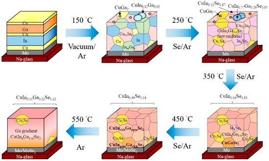 - Yeh, M.-H.; Ho, S.-J.; Wang, K.-C.; Hsu, H.-R.; Chen, G.-H.; Chen, H.-S. Toward low-cost large-area CIGS thin film II: Out-of-plane compositional variations of sequentially electrodeposited Cu/In/Cu/Ga/Cu stacked layers selenized in rapid thermal process. Sol. Energy 2016, 129, 116–125. [Google Scholar] [CrossRef]