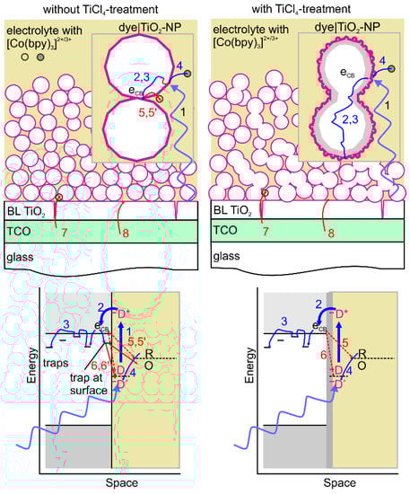 Schematic structure and electron loss processes in dye sensitized photoanodes without and with TiCl4-treament. Desired (forward) processes are in blue, unwanted (backward) processes are in red; (1) Light absorption by the dye; (2) electron injection of photo-excited dye into the conduction band of TiO2, (3) electron transport by trap-diffusion process, (4) dye regeneration by electron transfer from reduced form of the mediator, (5) back electron transfer from TiO2 conduction band to the oxidized form of the mediator, (6) back electron transfer from TiO2 conduction band to the photo-oxidized dye molecule; (7) electron transfer from the back contact to the oxidized form of the mediator; (8) electron transfer from the back contact to a photo-oxidized dye molecule. The processes 5′ and 6′ denote corresponding processes starting from a trap state near the surface. Abbreviations; BL, blocking layer; TCO, transparent conducting oxide (back contact); D/D*D*, dye/ photo-excited dye/ photo-oxidized dye; R/O, reduced/oxidized form of the redox mediator (also as /-). The top row shows a schematic sketch, the lower row and simplified energy diagram of the solid|liquid interface.