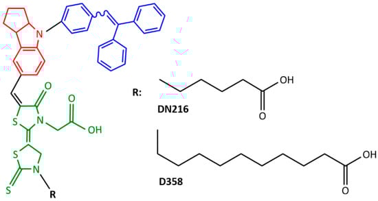 Despite extensive work to improve photovoltaic characteristics of the TiO2 photoanode, little information has been obtained about the quantitative effect of post-TiCl4 treatment and sensitization processes on the dye-regeneration kinetics (process (4) in Figure 1). In this regard, scanning electrochemical microscopy (SECM) provides an evaluation of the dye regeneration rate constant (kox) for process 4 in Figure 1, that measures the ability of the mediator to reduce the photo-oxidized dye adsorbed on the photoanode [29,31,32]. In this work, SECM analysis is applied to passivated TiO2 photoanodes sensitized with the all-organic dye molecules D358 or DN216 (Figure 2) [33,34]. These molecules have an aliphatic chain terminated by a carboxylic group that attaches it to the semiconductor surface. A long anchoring chain prevents dye-aggregation [35] and reduces ET of eCB to the oxidized form O of the mediator [36,37] by limiting the proximal approach of O, e.g., [Co(bpy)3]3+, to the semiconductor surface [2,38]. However, sterically demanding dyes can hinder the diffusion of the mediator in the pore space (internal diffusion), a trend that is expected to become more relevant for sterically demanding mediators like [Co(bpy)3]2+/3+ and photoanodes with smaller pores [39]. This would result in less effective dye-regeneration kinetics. The steady-state approach curves in the SECM feedback modes combined with a kinetic model introduced before for the evaluation of the dye regeneration in sensitized TiO2-based photoanodes by cobalt-based mediators [32] provides a rate constant kox that is again an effective constant bearing a relation to structural features that influence the internal diffusion of the mediator in the porous photoanode.