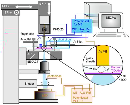 The setup for scanning electrochemical microscopy has been detailed before [32,34,42] and was run by the program SECMx [43]. The setup is shown in Figure 3 and included a piezoelectric actuator and the control electronics (P780.20 and E665, Physik Instrumente, Karlsruhe, Germany) for vertical approach, a digital potentiostat (Ref600, Gamry Instruments, Warminster, PA, USA), three SPI motors (SPI Robot, Oppenheim, Germany) to coarsely move the microelectrode (ME) relative to the sample and the light beam, and a two-dimensional positioning system (Nexcact N661.21A with controller E681, Physik Instrumente) for moving the sample horizontally at a fixed relative position between the microelectrode and the light beam. The samples were illuminated on an area of 1.5 mm2 by a blue LED (455 nm) at photon flux Jhv ranging from 0 to circa 2 × 10−7 mol cm−2 s−1. The illuminated area was selected far off the edge of the photoanode. The precise location of the analyzed area did not influence the measurements because possible local variations of properties are average on the length scale of the used microelectrode. The LED was powered by an XPOT potentiostat with a photodiode (both Zahner Elektrik, Kronach, Germany) in the beam to measure and control the actual light intensity. The light intensity was calibrated with a power meter (Gigahertz-Optik, Türkenfeld, Germany). The light beam is focused with a lens on the sample (10×, Carl Zeiss, Jena, Germany). A schematic of the setup is provided in Figure 3.