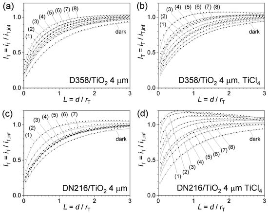 Normalized SECM feedback mode towards (a) 4 µm thick D358/TiO2 electrode without and (b) with post-TiCl4 treatment, and (c) 4 µm thick DN216/TiO2 without and (d) with post-TiCl4 treatment; in 0.1 mM [Co(bpy)3](PF6)3 + 0.1 M TBAPF6 in acetonitrile. Lines are fitted curves according to the model described in SM-2 [45]; dfilm = 4 µm; Au microelectrode rT = 28.85 µm, ET = −0.15 V, vT = 1 µm s−1; illumination at 455 nm with Jhv in 10−7 mol cm−2 s−1 of (0) dark, (1) 0.05, (2) 0.12, (3) 0.19, (4) 0.24, (5) 0.32, (6) 0.51, (7) 0.64, (8) 1.93. The intensities in 1015 cm−2 s−1 are 3.0, 7.2, 11, 14, 19, 31, 38, 116.