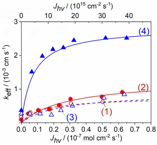 Plot of experimental keff vs. Jhν for (1 -) D358/TiO2 4 µm, (2 ) D358/TiO2 4 µm with post-TiCl4 treatment, (3 8) DN216/TiO2 6 µm, and (4 7) like DN216/TiO2 6 µm but with post-TiCl4 treatment. Solution 0.1 mM [Co(bpy)3](PF6)3 + 0.1 M TBAPF6 in acetonitrile. The keff values were derived from the fitting of the approach curves in Figures S2 and S3 to the model in SM-2. The solid lines in Figure 5 were derived from Equation (3) and fitting parameters are detailed in SM-4.