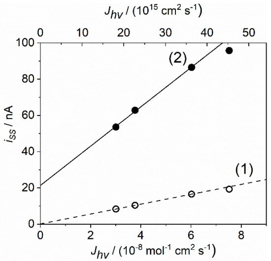 Plot of steady-state photocurrent iSS under constant illumination, as a function of light intensity Jhv for (1 -) 4 µm DN216/TiO2, and (2 ) 4 µm DN216 on post-TiCl4 treated TiO2. The lines are linear fits.