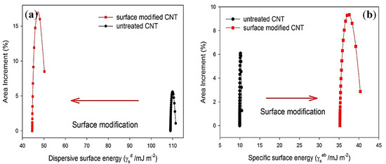 As shown in Figure 2a, the dispersive surface energy probability function of the MWCNTs became more spread out by surface modification, indicating a higher degree of energetic surface heterogeneity. The small changes in the surface energies of untreated MWCNTs indicate that its surface is energetically homogeneous. Surface modification led to a greater variation in , suggesting that the surface of the OMAEA-modified MWCNTs is energetically heterogeneous (Figure 2b). The of treated MWCNTs showed a higher value compared to untreated MWCNTs, which was due to increasing the concentration of polar clusters on the surface of MWCNTs [45].