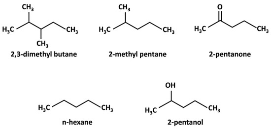 Structural probes (2,3-dimethyl butane (C4Me2), 2-methyl pentane (C5Me), n-hexane (C6)) and chemical probes (2-pentanone (C5=O), 2-pentanol (C5-OH)).