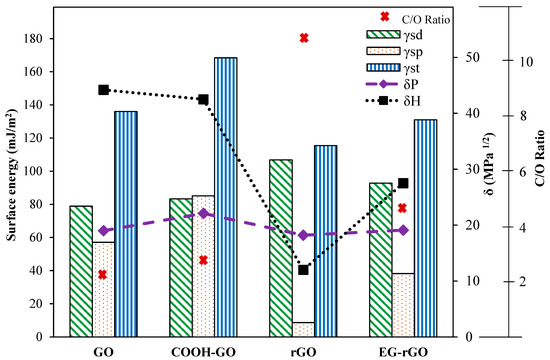 The surface energy and the C/O ratios, which are dependent on the surface groups and degree of the modification, affect the δP and δH. As shown in Figure 4, the is increased by increasing the C/O ratios. The number of oxygen-containing groups of reduced graphene oxide (rGO) is lower than that of GO, which results in a higher value of of rGO. The contact angle measurement results showed that the hydrophilicity of the GO samples is as follows: rGO < EG-rGO < GO < COOH-GO. The considerable decrease in the hydrophilicity of rGO can be attributed to the presence of less oxygen-containing groups on the surface compared with carboxylated GO, which contains several oxygen-containing groups (such as –C–OH, –OH, C=O, and C–O–C). They have reported that the lower amount of polar oxygen-containing groups of the materials resulted in the smaller values of polar and total surface energies. The dispersibility of all GO samples was dependent on the degree of modification, surface groups, and Hansen solubility parameters of solvents.