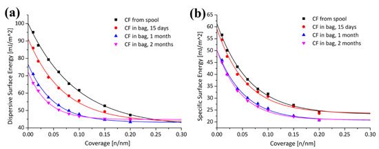Contaminated carbon fiber (CF) may affect their end-use in reinforced composite materials. Li et al. [43] investigated the surfaces of CFs, which were stored in polyolefin zip-lock bags for possible contamination at different storage times. The and profiles of the CFs at different storage times are shown in Figure 6. In comparison with the zip-lock bag stored fibers, the CFs from the spool with higher dispersive and specific surface energy are energetically more active and more heterogeneous and decreased by increasing the storage time.