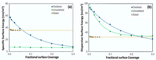 Huson et al. [40] measured the dispersive surface energy of different carbon fibers (CFs) using polar and non-polar probes at 70 and 120 °C. The higher temperature of 120 °C was used for the oxidized sample due to its higher total surface energy. Both the unsized fibers exhibit high maximum values in excess of 90 mJ/m2, which is typical of graphitic carbon materials. Oxidation results in an increase in polar groups on the surface of the fiber and a slight decrease in . The energetic heterogeneity of the unoxidized fiber is solely due to a range of dispersive energies, whereas the oxidized fiber is heterogeneous in both dispersive and acid–base surface energies (Figure 7). Sized fibers exhibited an increased specific and total surface energy leading to increased polarity. The overall polarity of the carbon fibers is reported as follows: unoxidized < oxidized < sized. This increased polarity in the sized fiber is consistent with the fact that sizing is known to improve the wettability of carbon fibers due to the polar species in the epoxy polymers.