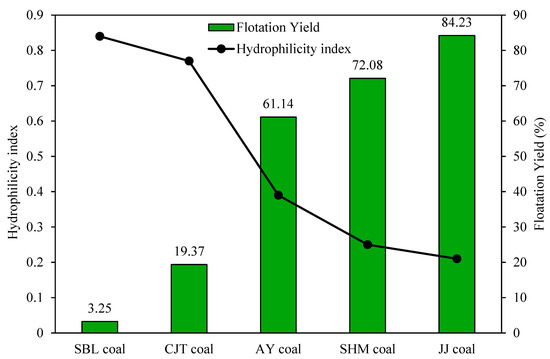 The surface energies and the hydrophilicity index of the coal samples are shown in Table 5 and Figure 8. The flotation of coal samples increased in the following order: SBL > CJT > AY > SHM > JJ, while the hydrophilicity index decreased in the same order. The JJ coal with the highest flotation concentrate yield owns the lowest hydrophilicity index. They also reported that the work of adhesion of samples had a similar trend with the hydrophilicity index that can indicate the wettability of the samples. There is a good correlation between the hydrophilicity index, which is calculated from the surface energy of the coals and their flotation yield, and the introduced parameter can be used as a promoting factor to predict the flotation recovery of fine coal in industry.