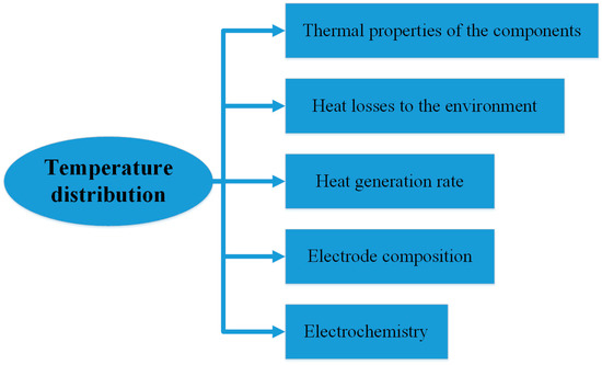 Lithium-ion batteries should work at optimum temperatures in an extensive range of environmental temperatures and working conditions to achieve maximum utilization of lithium-ion batteries in electric vehicles [11,12]. The aforementioned is essential, especially with fast charging and discharging cycles. Factors affecting the temperature of lithium-ion batteries are illustrated in Figure 1.