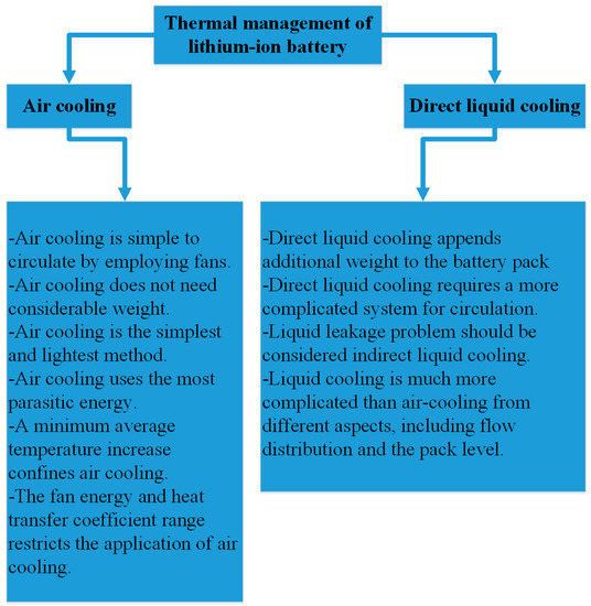 Lithium-ion battery thermal management is indispensable in attaining the functioning and lengthening of lithium-ion batteries’ life in electric vehicles. One of the critical issues of employing lithium-ion batteries in electric and hybrid vehicles is appropriate thermal management. Proper thermal management is essential with the intention of controlling degradation at a satisfactory rate. It is crucial to decrease the risk of thermal runaway. Figure 2 demonstrates a comparison between direct liquid cooling and air cooling. Figure 3 shows and describes an example of a lithium-ion battery cooling system.