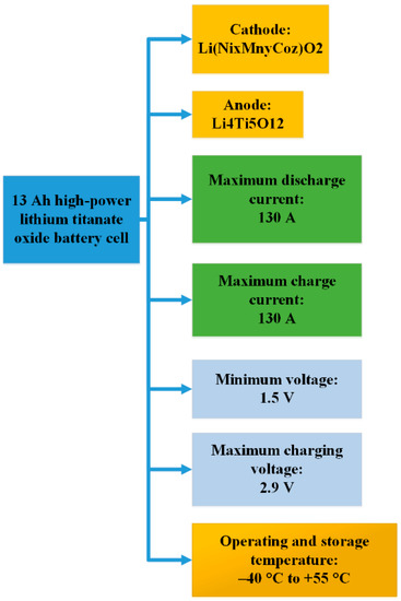 A total of 13 Ah pouch type commercial lithium titanate oxide lithium-ion battery cells were used in the present research. Lithium titanate oxide-based lithium-ion batteries have a better performance and lengthiest life concerning discharging and charging energy capacity and safety over an extensive temperature range compared with other lithium-ion batteries [16]. Characteristics of the lithium titanate oxide lithium-ion battery are demonstrated in Figure 6.