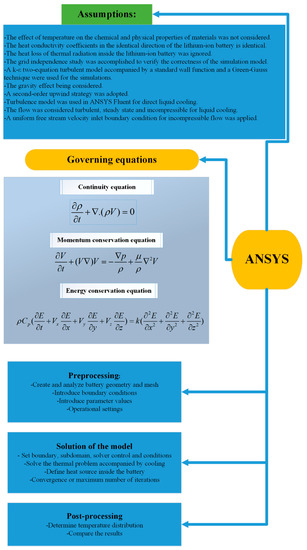 The data obtained from isothermal battery calorimeter model number 284 allowed the distinguishing and characterizing of lithium-ion batteries’ thermal aspect. It also assisted in developing appropriate arrangements for lithium-ion battery thermal management systems. Suitable modeling can be advantageous to predict the lithium-ion battery’s thermal behavior and improve the heat management system’s design. Modeling is the cheapest way to investigate the effect of various parameters such as the type of coolant, heat transfer mechanism and system geometry on the thermal management system performance. A representation of the lithium titanate oxide battery pack’s research methodology is demonstrated in Figure 8. The parameters of the thermal management system employed in this research are displayed in Table 2. In addition, the properties of air, dielectric water/glycol (50/50) and dielectric mineral oil are shown in the table [17].