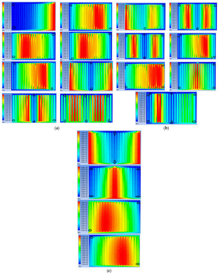 Three different cooling fluids including air, dielectric water/glycol (50/50) and dielectric mineral oil were used and different flow arrangements were proposed. The fluid inlet velocity was considered 20 m/s, 0.08 m/s 0.08 m/s for air, dielectric mineral oil and dielectric water/glycol (50/50), correspondingly. The lithium-ion battery assembly’s modeling results including the temperature distribution inside the assembly for different coolant arrangements during a 52 A discharge are shown in Figure 9. The thermal management of the lithium-ion battery pack by using air is shown in Figure 9a. The thermal management of the lithium-ion battery pack by using dielectric mineral oil is shown in Figure 9b. Figure 9c demonstrates dielectric water/glycol (50/50) cooling.