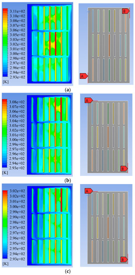 The black arrows inside each figure show the direction of movement of the cooling fluid flow inside the lithium-ion battery set. As can be seen, the fluid entered the collection from a corner and exited the collection from another corner on the same or a different side. As also seen in some parts, the lithium-ion batteries’ heat was not well managed. In other words, the cooling system was not able to remove the produced heat proportionally. The aforementioned may be due to the low flow and high temperature of the coolant around them. This caused a high temperature difference between the lithium-ion batteries.