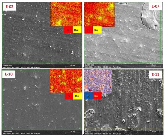 The samples were first subjected to morphological characterization by SEM-EDX analysis. The images shown in Figure 1 refer to only E-02, E-07, E-10, and E-11 to compare the sample E-02, considered as a referent, with a sample presenting an increased number of deposits (E-07), with a sample obtained via drop cast (E-10), and with a sample subjected to a milder intermediate thermal treatment (E-11), respectively. The deposits displayed a substantially even distribution of the oxide film with the presence of some RuOx aggregates probably due to insufficient mixing of the solution or to imperfections of the surface. This result was also confirmed by the element distribution maps, here included as insets.