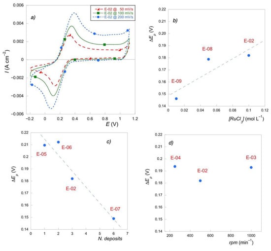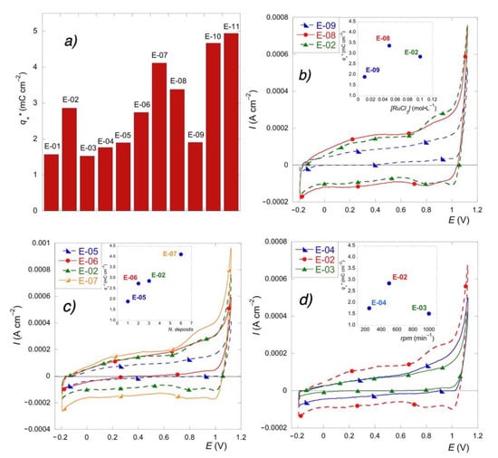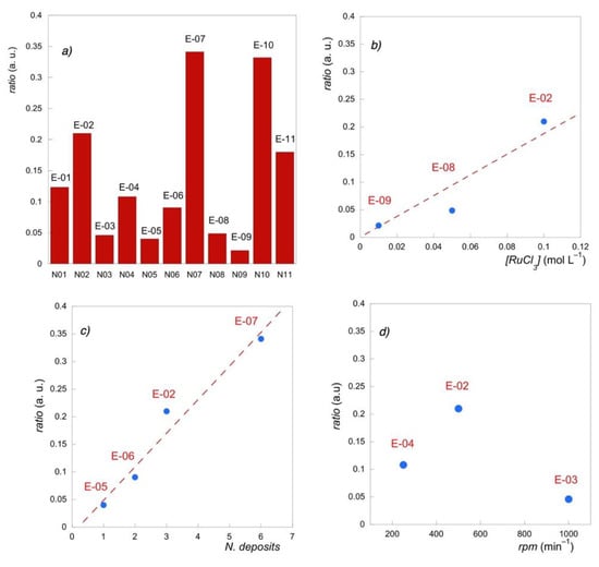 From EDX data, for all the samples, the atomic ratio of ruthenium to the amount of ruthenium and titanium was calculated using Equation (1) (Figure 2a). This value provides a rough estimate of the Ruthenium present on the electrode surface. The effects of the concentration of the precursor salt (Figure 2b), the number of deposits (Figure 2c), and the rotation speed (Figure 2d) were also reported separately.