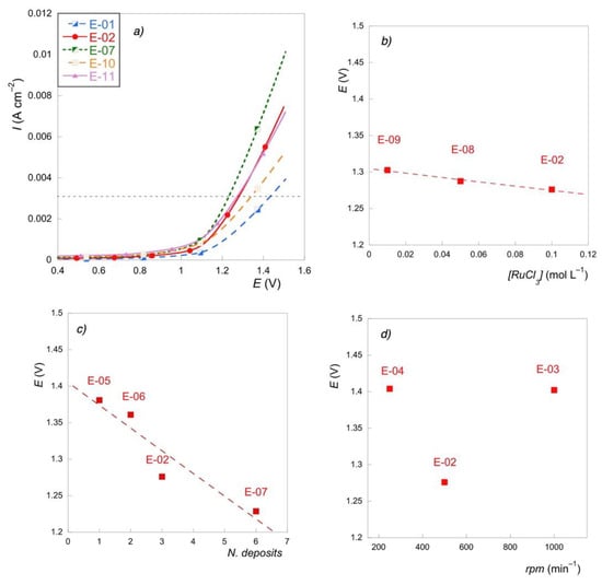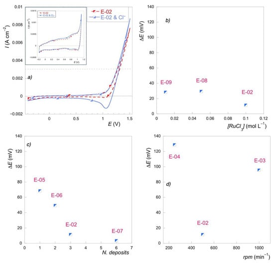 The comparison of the potentials corresponding to the current of 3 mA∙cm−2, obtained from the voltammetry recorded with and without chlorides, indicates that the discrepancy, and, therefore, the selectivity, remains constant as the concentration of the precursor salt solution varies. This can be explained assuming that, in the considered range, even the lowest tested concentration provides a consistent amount of RuOx (Figure 6b). Instead, the difference between the potentials tends to decrease as the number of deposits increases (Figure 6c) and with the central rotation speed value (Figure 6d), which has been, to date, attributed to the greater amount of deposit and, therefore, to the greater concentration of active sites.