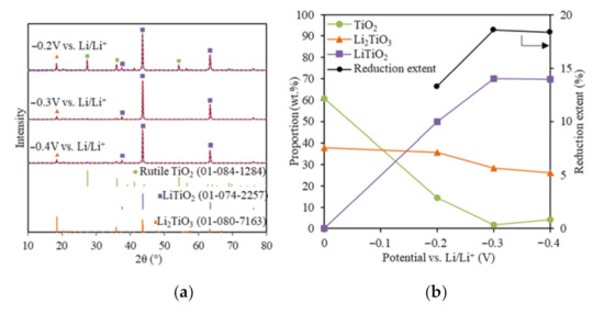 The TiO2 content further decreased to 1.69 wt.% at −0.3 V, which lay under the XRD detection limit (~2%). The Li2TiO3 decreased from 35.7 to 28.3%, while the partial reduction product, LiTiO2, increased from 49.8 to 70.4%. This suggested that both Li2TiO3 and TiO2 were transformed into LiTiO2 at a higher reduction potential (Equation (8)) and TiO2 was more reducible than Li2TiO3. The reduction of Li2TiO3 to LiTiO2 is a reversible reaction [29,30]. As the cathodic reduction potential further increased to −0.4 V vs. Li/Li+, LiTiO2 stayed almost the same, while both TiO2 and Li2TiO3 only changed slightly within the XRD limit.