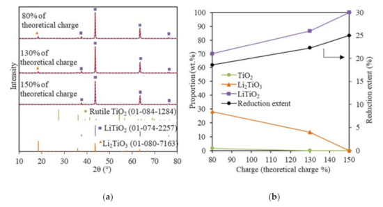 Using 80% of the theoretical charge only led to an 18.6% reduction of TiO2. Thus, further investigation was carried out for TiO2 electrolytic reductions by employing increased charges, namely 130% and 150% of the theoretical charge, at the optimal cathodic potential, namely, −0.3 V vs. Li/Li+.