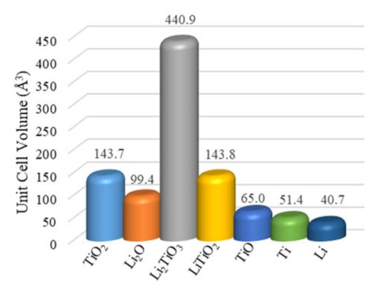 Unit cell volumes for the related chemicals during the TiO2 electrolytic reduction in the molten LiCl–Li2O (1 wt.%) at 650 °C.
