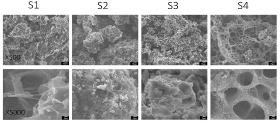 SEM imaging allows for the detailed topographical analysis of the soy-based co-doped materials. Interestingly, all soy materials displayed distinct morphology since their chemical compositions were not same. As shown in Figure 1, S1 tended to have a flaky but rugged surface morphology with wide depths present, indicative of a porous structure. S2 presented with more clumpy, three-dimensional, spaced-out structures. Indications of pores were not as prevalent in the S2 material compared to S1, S3 and S4, even at higher magnifications. Comparatively, S3 was shown to have a more convoluted topographical appearance with surface depths of different size ranges. At higher magnifications, these depths appeared to be very deep. S4 demonstrated a morphology similar to that of a sponge—flat, with a very distinct holey layout. The SEM image depicted a highly porous morphology of S4 material. At higher magnifications, there were small bubble-like structures occupying the walls of S4. These spherical arrangements have been observed in similar composites that are highly oxidized [43,44]. This may contribute greatly to surface area and pseudocapacitance (electrochemical energy storage) of the material.