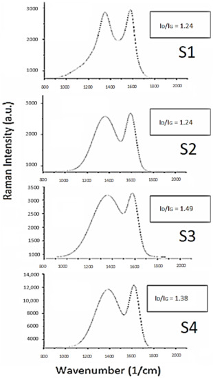 As shown in Figure 2, all soy materials showed features of functionalized carbon due to phosphorus and nitrogen doping, which is supported by defect ratios above one. S1 exhibits the narrowest D peak, indicative of a smaller amount of doping, whereas the other doped soy materials depict wider D peaks, supporting the higher doping effects of these materials. Material S3 demonstrated the highest amount of disorder, whereas S1 and S2 showed the lowest disorder—which could be due to the soy precursors’ reaction pathways during the doping process [53], or simply the presence of a slightly higher degree of graphitization than S3 and S4 [54,55].