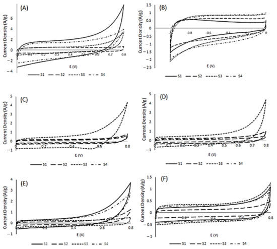 Cyclic voltammetry was performed to investigate the energy storage potential of the doped carbon materials derived from soy. Electrochemical investigations were conducted on co-doped soy-based materials S1–S4 in acidic, basic and salt electrolytes. All electrochemical results were analyzed and compared to investigate the potential of soy materials for supercapacitor application. All materials exhibited quasi-rectangular voltammograms, supportive of electric double-layer capacitance (EDLC) as the dominant form of energy storage in the given conditions. As per Figure 3, S1 exhibited the highest current density with a maximum observed specific capacitance of 127 F/g in acidic conditions, as shown in Table 4. The second highest current density was observed for material S4 in acidic conditions with a specific capacitance of 112 F/g. However, the materials did not exhibit a superior performance in basic media. In basic conditions, material S4 had the highest specific capacitance value of 94 F/g. Material S4 seemed to have strong hybrid capacitive behavior compared to the other materials in acidic and basic conditions, given that its specific capacitance values were over 90 F/g in both acidic and basic electrolyte. S4, along with S1 appeared to have better electrochemical performance in H2SO4, with a notable decrease in specific capacitance in KOH. S2 electrochemical behavior is very weak; this is attributed to its hexane treatment, which affects its charge storage characteristics. S3 demonstrated the second highest capacitive behavior in basic conditions. Most likely, this is due to the highly oxidized surface shown in Table 2. However, its specific capacitance dropped significantly with increases in scan rates (Figure S2 in the Supplementary Materials). Thus, S3 is a highly unstable material, whereas Figure S2 shows that S1, S2 and S4 sustained 80% specific capacitance when scan rates were altered from 5–100 mV/s. Multiple cycles showed that S3 was the most unstable material among all soy samples.