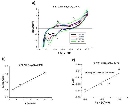 The electrochemical properties of iron were studied by cyclic voltammetry (CV) in deaerated (by argon) 0.1M Na2SO4 solution. Figure 1a presents the influence of scan rate (1, 3, 5, and 10 V/min) on the CV curves performed at 20 °C. In the anodic region, two areas can be distinguished: one below the potential of about −0.6 V (area of a1 peak), corresponding to the formation of the surface product FeII (FeO/Fe(OH)2), and one above the potential, corresponding to the formation of the FeII/FeIII layer (area of a2 peak) (magnetite [34]). The latter is not a barrier film but a well-conducting film, thus a significant increase of the current density at potentials higher than −0.6 V, attributed to the anodic reaction occurring at the surface layer/alloy substrate interphase, can be observed. In the backward curve (Figure 1a) the peaks c2 and c1 correspond to the reduction of solid surface products such as magnetite and FeII compound, respectively.