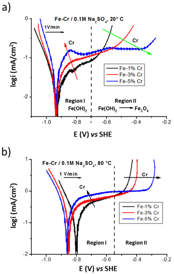 Figure 3 shows polarization curves performed on low chromium binary Fe-Cr alloys (with 1, 3, and 5% of Cr) in 0.1M Na2SO4 electrolyte deaerated with argon at 20 and 80 °C. In the region I, an increase of the anodic current (red arrow in Figure 3a) as a function of chromium content can be explained by fast dissolution of alloy, with the formation of thinner layer (with the surface compound Fe(OH)2 formed at E vs. SHE < −0.7 V). At higher potentials, the region II (E vs. SHE > −0.7 V) corresponds to the formation of barrier, magnetite-like layer (oxidation of Fe(OH)2 into Fe3O4) enriched in chromium compounds. The increased stability of this barrier layer as a function of the higher chromium content can be evidenced by the displacement of the current density increase to higher potentials (marked by green arrow): −0.68 V for the Fe-1% Cr, −0.55 V for the Fe-3% Cr, and −0.31 V for the Fe-5% Cr.