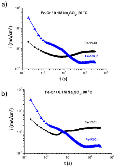 In order to determine the effect of chromium on the formation of the anodic surface layer, chronoamperometry measurements were performed at a constant potential (at E vs. SHE = −0.5 V) (Figure 4). A higher chromium amount (5% Cr) significantly increases the rate of the anodic reaction in the first few seconds, which is consistent with the higher current density of the plateau in the region I (Figure 3). However, after a longer time (~15 s) of exposure at 20 °C, a current decrease (almost 7 times lower for Fe-5%Cr than for Fe-1%Cr) can be observed. At 80 °C, a higher discrepancy (almost 10 times) between the current densities for both samples can be observed. The higher anodic dissolution of Fe-5%Cr alloy in the first seconds of polarization leads to more rapid nucleation of the surface product due to higher chromium content, which leads to a faster saturation of surface anodic product. The rapid nucleation, enhanced by higher chromium content, results in the formation of a more uniform, crystalline-like layer of corrosion product (magnetite-like) [22], and/or more complex and stable spinel compound FexCr3−xO4 [29] on Fe-5%Cr than on the Fe-1%Cr. Therefore, this layer shows better barrier properties during the long time exposure. The higher temperature leads also to faster formation of surface products and stabilization of current density (5 s vs. 15 s for 20 and 80 °C, respectively).
