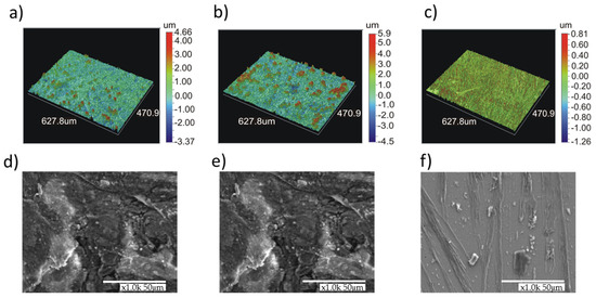 Surface morphology images performed by a laser profilometer and SEM images of Fe-1% Cr (a,d), Fe-3% Cr (b,e) and Fe-5% Cr (c,f) alloys after chronoamperometric measurements at a constant potential (E vs. SHE = −0.5 V) in 0.1 M Na2SO4 at 80 °C.