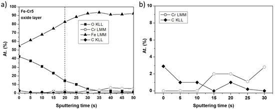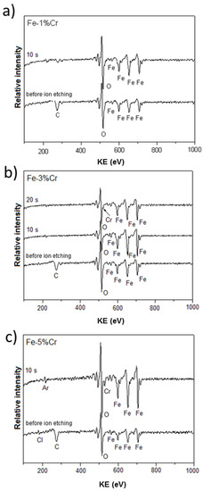 Figure 6 presents the typical Auger spectra taken locally (lateral resolution ~25 nm) at the surface of investigated alloys after chronoamperometry at a constant potential −0.7 V, corresponding to the prepassive region. All spectra revealed that the oxide layers are enriched in Fe and O. For the alloy with the 1% Cr content (Figure 6a) no chromium signal was detected. However, Cr signals were detected for the Fe-3%Cr (Figure 6b) and Fe-5%Cr alloys (Figure 6c) after 10 s or 20 s of sample sputtering by argon ion gun, respectively. This kind of careful etching (ion energy 3 keV, crater size 36 mm2) was used to remove carbon contamination present on the extreme surface (the first few nanometers).