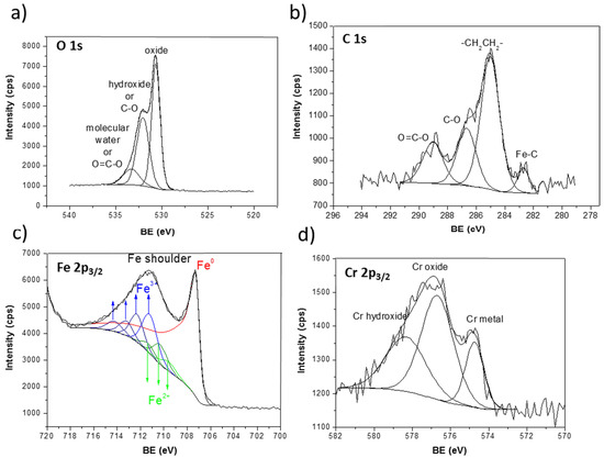 The Cr 2p3/2 spectra presented in Figure 8d were decomposed into three peaks located at 574.7, 576.7, and 578.3 eV, which can be attributed to metallic chromium, Cr2O3 and Cr(OH)3 [48,49,50,51,52].