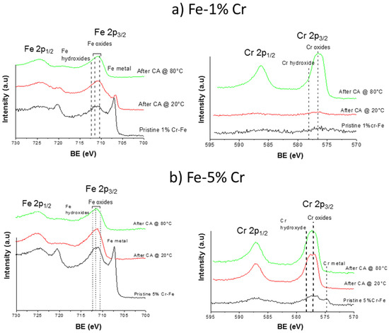 The polarization of both alloys significantly modifies the composition of the surface layers. Figure 9 shows the comparisons of Cr 2p and Fe 2p core level spectra obtained for pristine samples and after the CA measurements at 20 and 80 °C for Fe-1% Cr (a) and Fe-5% Cr (b) alloys. In a case of low quantity of chromium in alloy (Fe-1% Cr) a thin and/or not homogenous, rough layer with presence of defects is formed after sample polarization at 20 °C. The formation of this layer with lots of defects (i.e., cracks) was already confirmed by SEM measurements presented above. The composition of this layer seems to be almost similar to the native oxide layer which can be deduced from the presence of metallic iron visible at low binding energy (Figure 9a), Fe 2p spectra after CA @ 20 °C. Only slightly more intense the Fe 2p as well as the Cr 2p peak (Figure 9a) corresponding to oxides and hydroxides indicates a slight increase of thickness of this layer formed in the prepassive region when comparing to native oxide layer present on the pristine sample. The polarization of Fe 1% Cr samples at higher temperature (80 °C) leads to uptake of the anodic surface layer, which can be concluded from a complete attenuation of Fe metallic peak and presence of iron oxides/hydroxides. High intensity of Cr 2p peak indicates enrichment of anodic/corrosion layer in Cr-like components (mainly Cr2O3 and Cr(OH)3). The enrichment of the anodic layer in chromium when comparing to quantity of chromium present in the native oxide layer or the bulk material, has already been observed for higher Cr content Fe-Cr alloys [17,53,54,55]. The presence of both iron and chromium oxides can indicate a formation of spinel compound FexCr3-xO4 [29].