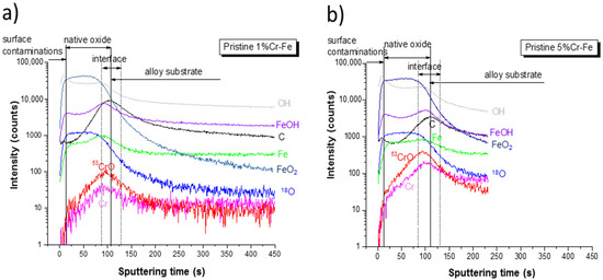 ToF-SIMS negative ion depth profiling was performed for both alloys in order to investigate the chemical surface and bulk composition of native oxides and anodic layers formed after polarization (CA measurements) performed in the prepassive region. Figure 10 shows the ToF-SIMS negative ion depth profiles for the pristine Fe-1%Cr and Fe-5%Cr samples. Note that the intensity is reported using a logarithmic scale, which emphasizes the low intensity signals. The variation of the ion intensity with sputter time reflects the variation of the in-depth concentration but it is also dependent on the matrix, from which the ions are emitted. Several regions can be identified. The first few seconds (13–15 s) of sputtering with small carbon and hydroxide peaks in the C− and OH− ion profiles, correspond to a very thin surface contamination film. The presence of contamination and hydroxide layer on the surface of both samples have been already confirmed by XPS analysis. The presence of surface hydroxide layer has been observed previously [17]. Then, a stable intensity of the FeO2− and O18− signals can be characteristic of the presence of a native oxide layer on the Cr-Fe alloy substrates. The width of a plateau corresponding to this oxide is slightly larger for the pristine sample with a higher chromium content, which can indicate a slightly thicker layer. The higher chromium content in the Fe-5% Cr alloys is clearly visible by the higher intensity of the Cr− and CrO− ion profiles both in the region of the native oxide layer and in the bulk of alloy substrate (Figure 10a,b), which also corroborates with the AES (Figure 6) and XPS results (Figure 9b). The intensities of both ion profiles (Cr− and CrO−) in the region corresponding to the native oxide increase with sputtering time, which indicates that the inner part of the native oxide at the native oxide/alloys substrate interface is enriched in the chromium oxides. From the ToF-SIMS profiles (a stable intensity of FeO2− profile) it can be concluded that the outer part of the native oxide layer is rich in iron oxides. These results clearly show a duplex structure of the native oxide layer present on the low chromium-content alloys, which is composed of the outer (iron-rich oxide layer) and inner (chromium-rich oxide) layers. The enrichment of the oxide layer in the chromium oxides increasing with sputtering time can be easily observed in Figure 11 from the intensity ratio of CrO−/FeO2− signals. The increase of some other ion profile intensities (C−, FeOH−, and OH−), in the area of the native oxide/alloy substrate interfacial region indicates a higher concentration of contaminants and hydroxides. The matrix modifications and different sputtering yields in this transition region between native oxide and alloy substrate resulting in higher ion intensities cannot be completely ruled out.