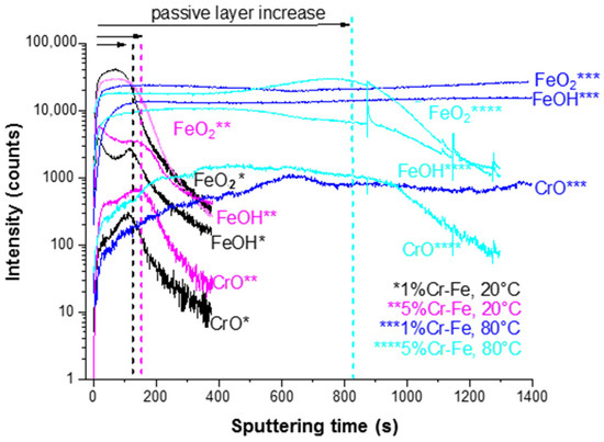 The significant modifications of ion depth profiles (Figure 12) can be observed after polarization (CA measurements) performed on both alloys already at 20 °C. The anodic films formed on the surface of aged alloys show modified chemical composition and thickness (Figure 12). A slight increase of the surface film thickness (marked as “passive layer increase” in Figure 12) can be observed after aging at 20 °C in comparison to pristine samples (Figure 10). The 5%Cr alloy shows thicker layer than those observed on the Fe-1% Cr alloy (Figure 12). However, a temperature increase up to 80 °C results in a significant increase of surface layer thickness, which can be deduced from much higher (~808 s for 5%Cr-Fe, 80 °C) sputtering time as compared to the Fe-5% Cr polarized at 20 °C (160 s). For the Fe-1% Cr sample after polarization performed at 80 °C it is very difficult to define the thickness of the surface layer due to a stable intensity of ion signals. It can indicate the enhanced formation of layer built of corrosion products composed of Fe-like species and lower quantity of Cr-species than those observed on Fe-5% Cr sample. Thus, it can be concluded that 1% of chromium content in the alloy is not enough to efficiently protect the substrate against corrosion in these corrosive conditions.